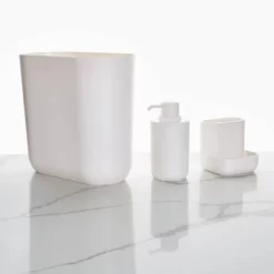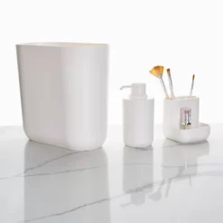 The 3-Piece Bathroom Accessory Set from The Cade Collection by iDesign is the perfect organization piece. This bathroom storage set includes a refillable soap dispenser with pump, toothbrush holder, and waste can. The iDesign bathroom organizer has a coconut finish to bring a cohesive look to your bathroom decor. The soap dispenser pump can hold up to 12 ounces of your favorite liquid soap or lotion. The plastic toothbrush holder features an attached tray to catch drips and keep countertops clean. The wastebasket has an oval shape, making it ideal for use in compact spaces in your bathroom or wherever you need convenient trash disposal. The waste basket measures 10.56″ x 5.5″ x 9.77″. Crafted from 100% post-consumer recycled plastic, this bathroom sink storage is built to last. Plus, it’s dishwasher-safe (top-rack) so it’s easy to care for. With iDesign, you can live simply every day.
