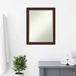 Give your bathroom the finishing touch with this 100% real wood Petite Bevel bathroom mirror. The Cyprus Walnut Narrow frame is an angled frame with a slightly lifted outer ridge. The finish is a rich walnut color with fine grain lines and darker edges.. The frame is 1.75 in. wide and stands 0.75 in. off the wall. It’s Individually made using traditional custom framing techniques, it has the quality you expect from your local frame shop. It holds its value with premium finishing that can be appreciated up close. Because of our attention to detail and focus on artistry, architects, interior designers, and homeowners alike choose this mirror to create beautiful living spaces.