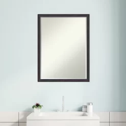 Give your bathroom the finishing touch with this 100% real wood Petite Bevel bathroom mirror. The Dark Bronze Scoop frame is a narrow frame with scooped, dark bronze surface and gold veining highlights.. The frame is 1 in. wide and stands 1 in. off the wall. It’s Individually made using traditional custom framing techniques, it has the quality you expect from your local frame shop. It holds its value with premium finishing that can be appreciated up close. Because of our attention to detail and focus on artistry, architects, interior designers, and homeowners alike choose this mirror to create beautiful living spaces.