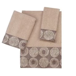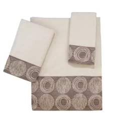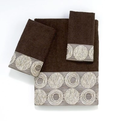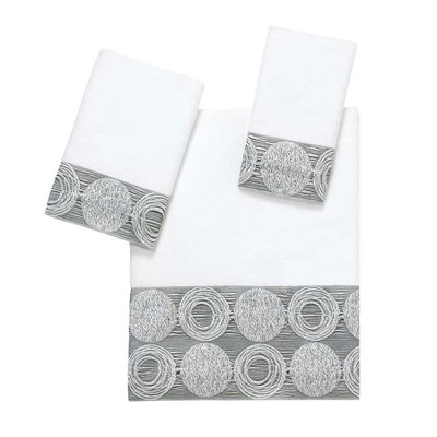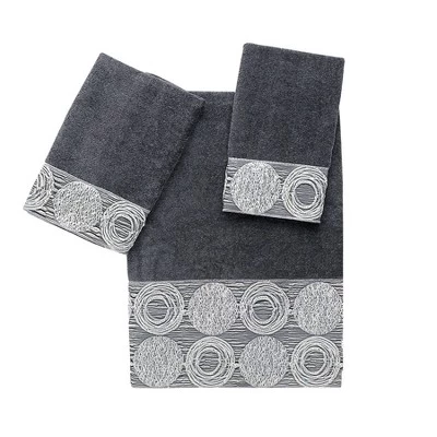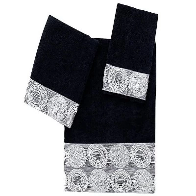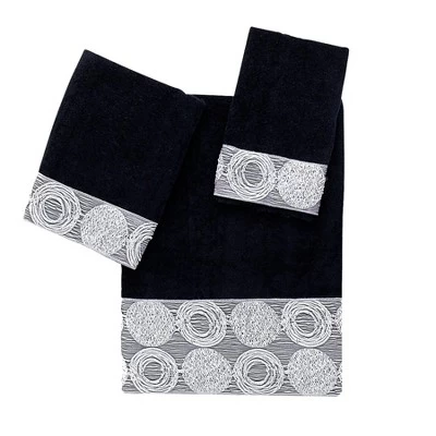 The Avanti Galaxy Black 3-Piece Decorative Towel Set features a contemporary jacquard woven metallic border design with irregular circles in shades of silvers and greys. 100% cotton (exclusive of embellishment) black velour towel. Set includes one each of bath, hand and fingertip towel. Sewn in the US, imported materials.