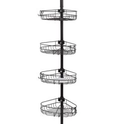 Add valuable storage into the corner of your tub or shower area with the Zenna Home Tension Pole Shower Caddy. With four baskets (easily adjusted or removed), a soap dish insert and hooks for washcloths and other toiletry items, this caddy provides an easy-to-install solution for any shower area that needs more storage space. No tools are needed for installation, and the caddy fits in spaces from 5 to 9 ft. high.