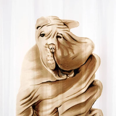 - Oversized puckered pooch design in multi-colors on white Add a whimsical touch to the place where you splish-splash