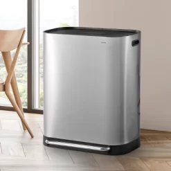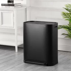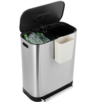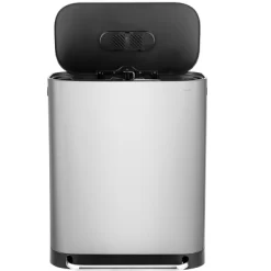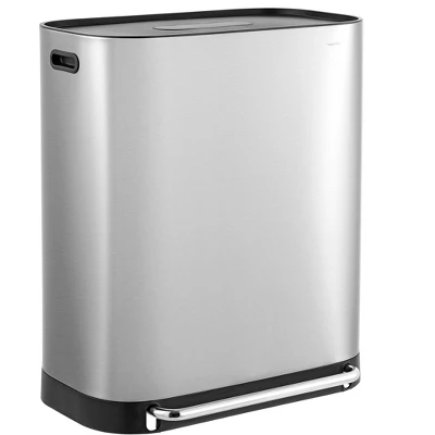 Our sleek, modern trash can combines quality construction with minimalist-style oval handles and a flat top. Tall, narrow design fits easily into any kitchen or office. Two removable liners let you sort trash and recycling, while an extra side bin collects kitchen scraps. Durable steel pedal-bar lets you dispose of trash hands-free.