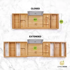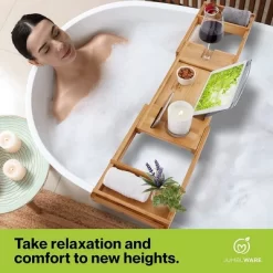 An at-home, spa-like experience Experience a calming, spa-like bath with the JumblWare Bamboo Bath Tub Tray Table. Enjoy a relaxing bath with a 100% bamboo-made bath tray for bathtub that adjusts to fit onto most standard bathtubs. This multifunctional, well-crafted bath caddy and bathtub table comes with convenient compartments to place all your necessities like a wine holder, tablet stand, soap tray, and more. This portable, luxurious bath caddy tray for bathtub makes for a wonderful housewarming, wedding, bridal shower, or anniversary gift. Take a load off and enjoy an at-home spa experience with a portable, water-resistant bamboo bathtub tray from JumblWare.