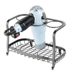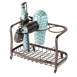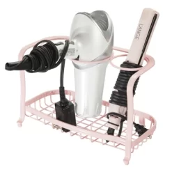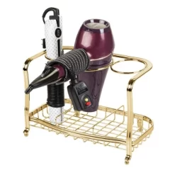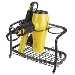 - STORES HOT TOOLS: Three compartments hold hair dryers, flat irons, curling irons and brushes, while the basket helps to corral cords; The steel wire lets you store tools even while they’re still hot