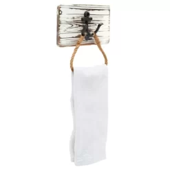This 2 pack of nautical towel holders will add to your nautical bathroom accessories while holding your towels. Designed with a worn wooden paint look and an anchor-designed towel holder, each hand towel ring is decorative and resourceful. It is great as a towel ring for the bathroom, but you can hang this in your garage, kitchen, or anywhere else you need to hold towels. Each rustic hand towel holder is 9 x 6 inches and comes with brackets on the back for easy hanging.