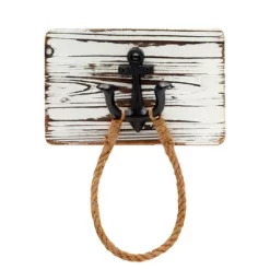 - Anchor Bathroom Decor: This towel holder has a worn wooden paint design and has an attached towel holder designed with an anchor to hold your towels and give you a nautical theme