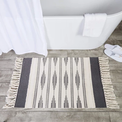 Protect your feet from the cold bathroom floor and place this grey bathroom mat with tassels next to the vanity, guest suite, or bathtub. The bohemian design is sure to complement and elevate your bathroom decor. The soft bath rug measures 2 x 3 feet; the ideal size to place outside the bathtub or shower.