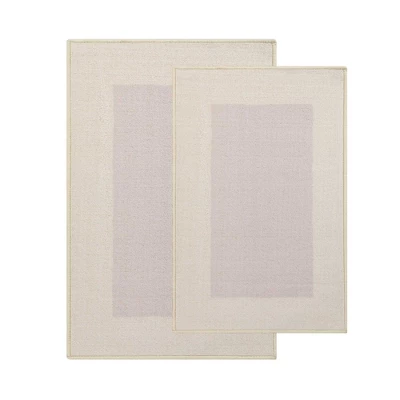 Pamper your feet with the Troy Highly-Absorbent Non-Slip Kitchen Rug Set of 2 by Blue Nile Mills. This rug set is crafted from premium Nylon that has a soft and luxurious feel while keeping your floors clean. This set is durable and non-slippery, due to its invisible non-slip latex spray backing. This set includes two rugs that you can place in front of your kitchen sink or shower. Each piece in this set is very flat and will clear just about any doorway. These rugs are available in elegant two tone color options including; cream/ grey, grey/ taupe, or tan/ mauve to coordinate with your existing home decor.