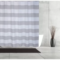 The Queen Stripe Fabric Shower Curtain by Moda, will add an elegant spa feel to your washroom space. This shower curtain features alternating stripes of waffle texture, and linen look polyester. Crafted in Light Grey/White. This elegant fabric shower curtain will work well with any décor. This shower Curtain Easy Care, Machine Washable. Made of 100% Polyester.