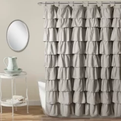 This curtain will immediately enhance the look of the master bathroom or guest bathroom. The ruffle detail adds a feminine touch as well as eye-catching texture to instantly improve the look of your space. This Ruffle Shower Curtain is perfect for those who love shabby chic style and fancy, frilly home decor. It’s simple yet feminine design creates a soothing atmosphere, ideal for relaxing at the end of a long day of work. Along with the design, the fabric is soft and lovely and will make your bathroom feel like you’ve just entered a spa. Measuring 72 inches wide by 72 inches tall, this Ruffle Shower Curtain is the perfect size for just about any bathtub. This style is available in many color options. It easily hangs with any shower curtain rings or hooks. The material is thin, so adding a liner is highly recommended. Due to the delicate nature of the ruffles, this shower curtain is dry clean only. Part of the Ruffle Collection.