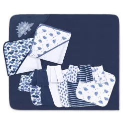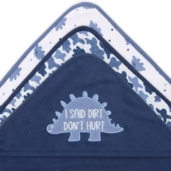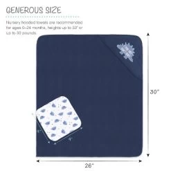 The Peanutshell baby bath towel and washcloth set is the most complete towel set you will ever need! Bath time with your baby boy will be sudsy fun with this 23 piece baby bath set. The blue dino design will make bath time into the most fun time with your little one. The baby towels in this set come with adorable hoods to wrap up your baby and simultaneously help them to dry quickly. If you have a baby shower to attend, don’t fret about the gift! This hooded baby shower gift set is a perfect and practical baby gift for newborn boys and girls alike. The set includes 3 large hooded towels (30 x 26) and 20 washcloths (9 x 9), each in super-soft printed and solid terry cloth. All towels in the set are made of a 80% Cotton and 20% Polyester blend which makes these soft for baby’s skin yet easy care.