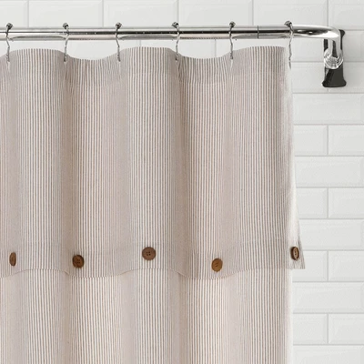 Stylish and versatile, the Tucker Stripe Shower Curtain offer everything you need to create the shabby chic, modern country home. This fashionable shower curtain is made from premium quality cotton and features the perfect ticking stripe, complemented by an attached valance and decorative wooden button embellishment. Soft cotton can be easily ironed to release stubborn creases and make your shower curtain wrinkle free. Delicately hemmed edge adds a finished look and prevents wear and tear. Sold as a single shower curtain measuring 72 inches wide by 72 inches long. Header features 12 button holes; hooks/rings not included. Coordinate with matching window curtain tiers and valance, sold separately. 100% cotton. Easy care, machine washable.