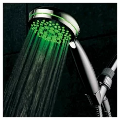 The HotelSpa Neon Ultra Luxury LED Hand Shower gives you features beyond compare. The Extra-Large 4.25-inch Chrome Face has 7 luxurious settings: a Power Rain, Pulsating Massage, Hydrating Mist, Mist/Massage, Rain/Mist and Water-saving Economy Rain & Pause modes. The LED lights automatically change according to the water temperature. Comes with an angle adjustable mounting bracket and stainless steel hose. Can be used as an Overhead or Handheld shower. Tools-free Installation and Limited 1 Year Warranty. Colors: BLUE – Cool under 95F (35C), GREEN – Warm 95-108F (35-42C), RED – Hot 109-122F (43-50C), FLASHING RED – Warning Hot over 122F (50C).