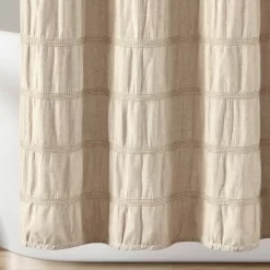 Update your master or guest bathroom with this woven cotton shower curtain which features textured horizontal stripes. This shower curtain fits well in a minimalist, traditional, or modern farmhouse style design theme. This Waffle Striped Shower Curtain measures 72 inches on each side. It hangs easily with any standard shower curtain hooks or rings. This shower curtain is safe to machine wash on a gentle cycle and tumbles dry on low. Please refer to the product label for full care instructions.